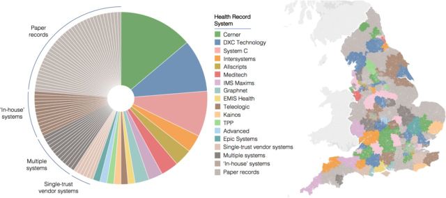 In questo studio abbiamo inizialmente identificato l’attuale distribuzione dei sistemi di cartelle cliniche in 152 ospedali per acuti in Inghilterra. Abbiamo scoperto che il 23% dei trust ospedalieri inclusi utilizzava ancora la documentazione cartacea, pari al 23,3% del totale degli incontri tra pazienti ricoverati, ambulatoriali e A&E. La maggior parte dei trust (77,0%) ha utilizzato un sistema EHR e oltre la metà di questi ha utilizzato uno dei tre sistemi di fornitori, nonostante siano stati identificati 21 diversi sistemi di fornitori EHR. La distribuzione dei sistemi in tutto il paese ha mostrato una sostanziale variazione. Alcune aree hanno dimostrato un certo grado di allineamento geografico dei sistemi EHR, come l’uso dei sistemi Cerner in diversi trust di Londra. In alcune regioni si possono osservare effetti residui di politiche precedenti, come il Programma nazionale per la tecnologia dell’informazione.11