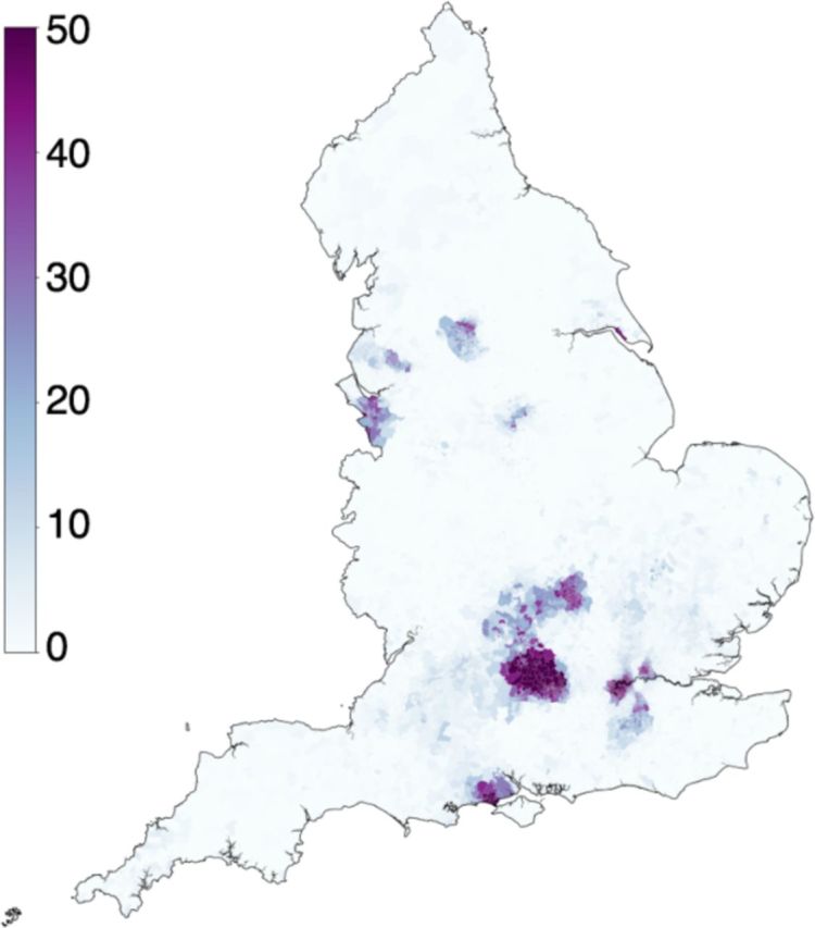 Figura 2.Figura 2. Mappa dell’Inghilterra che indica la probabilità che i pazienti in ogni Super Output Area di Livello Inferiore abbiano un incontro registrato sullo stesso tipo di sistema di cartelle cliniche, dove gli incontri consecutivi sono avvenuti in diversi trust. Le proporzioni vanno da zero (bianco) ad alta (viola scuro) probabilità di frequentare un altro trust utilizzando lo stesso sistema di cartelle cliniche.